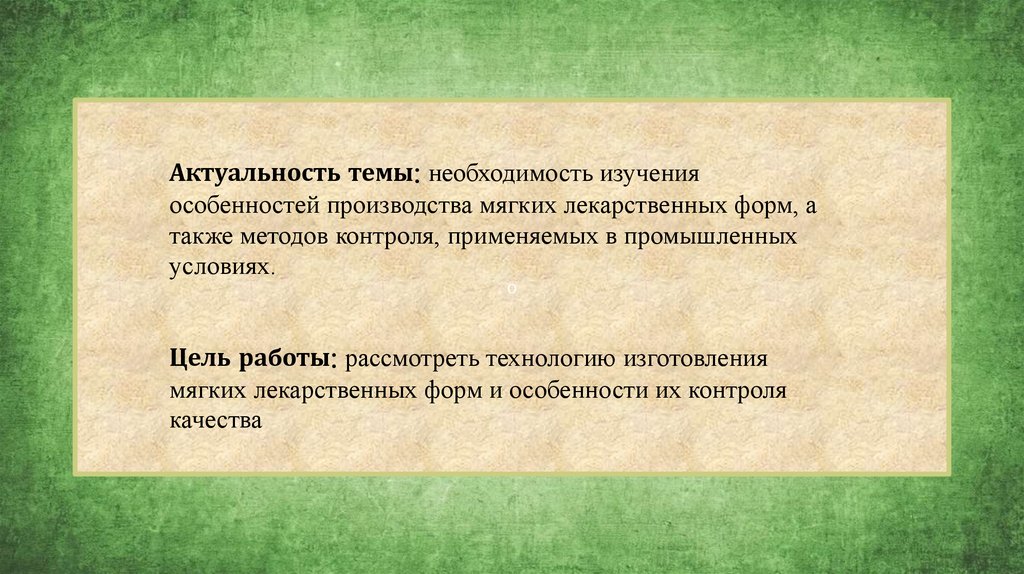 Актуальность темы: необходимость изученияособенностей производства мягких лекарственных форм, а