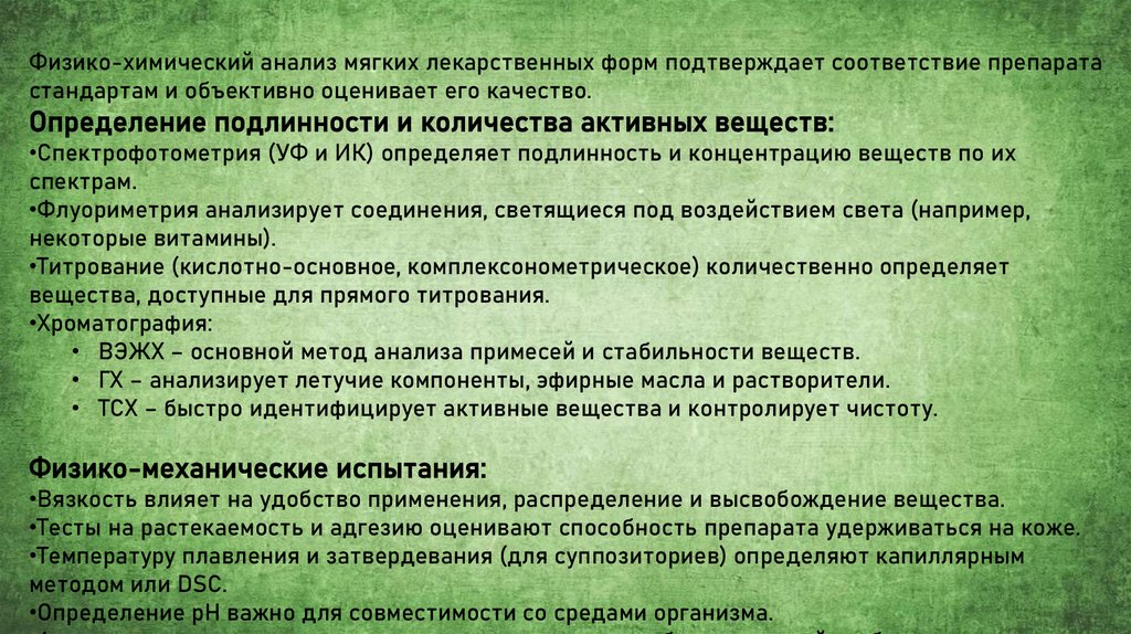 Физико-химический анализ мягких лекарственных форм подтверждает соответствие препаратастандартам и объективно оценивает его качество.