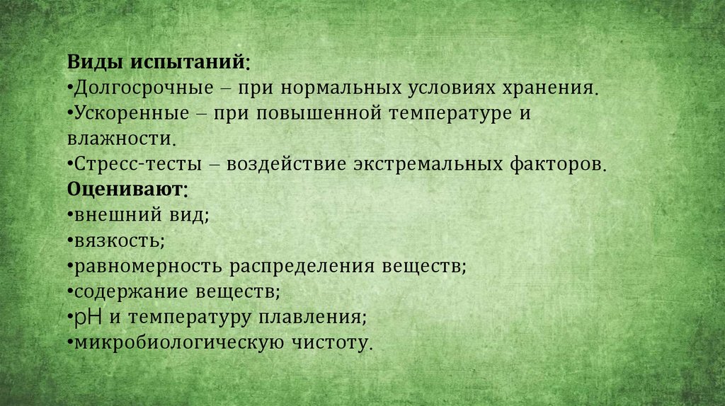 Виды испытаний:•Долгосрочные – при нормальных условиях хранения.