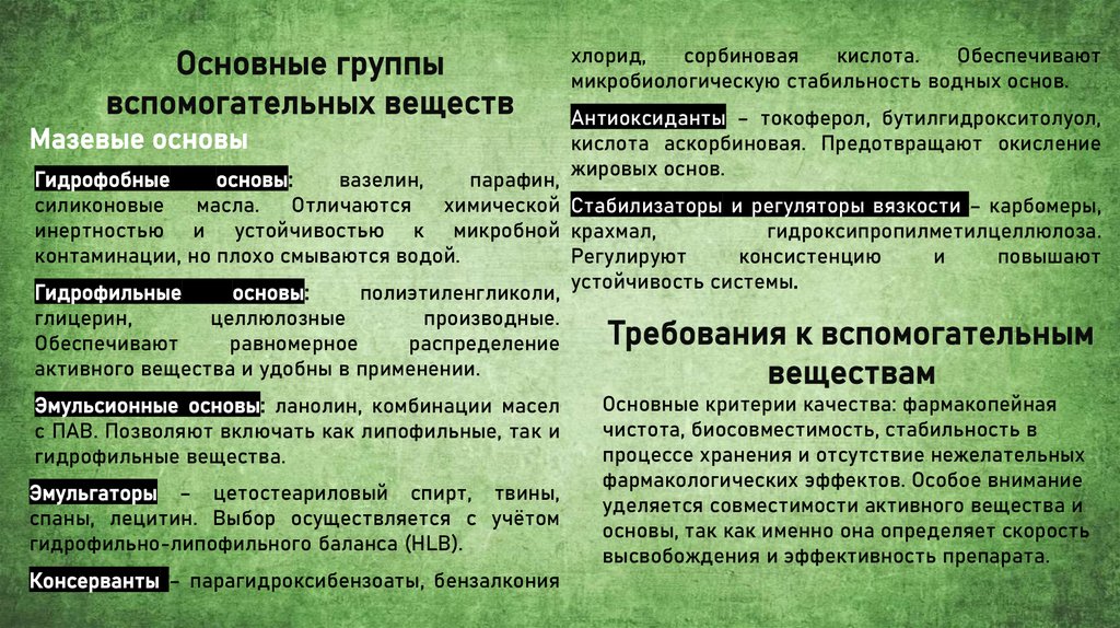 Сырье и вспомогательные вещества, используемые в производствеМягкие лекарственные формы (мазевые, гелевые, кремовые основы,