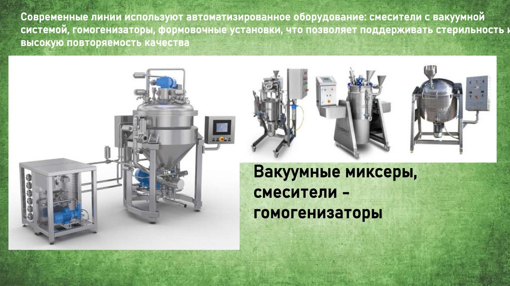 Современные линии используют автоматизированное оборудование: смесители с вакуумнойсистемой, гомогенизаторы, формовочные установки, что позволяет поддерживать стерильность и