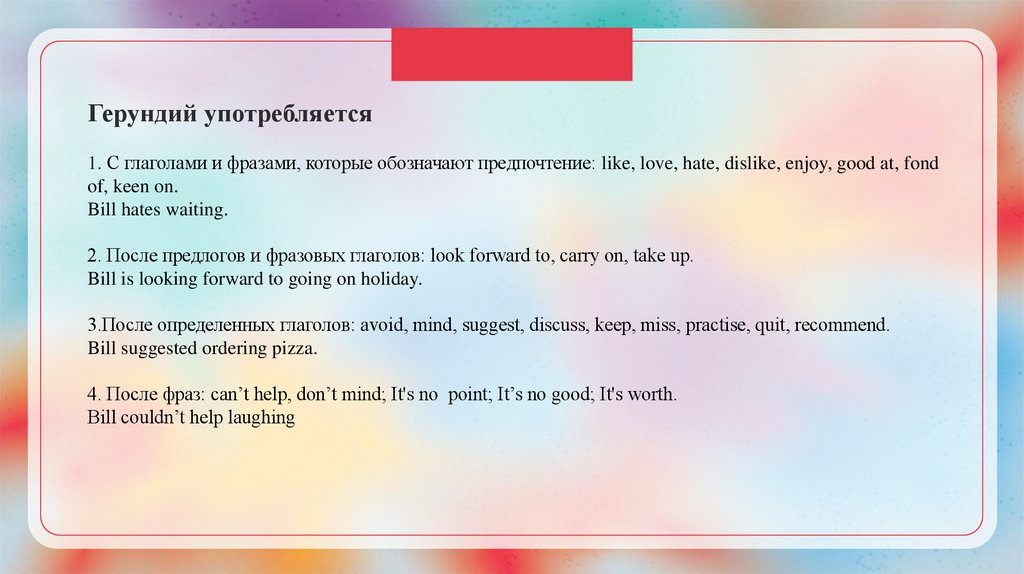 Герундий употребляется1. С глаголами и фразами, которые обозначают предпочтение: like, love, hate, dislike, enjoy, good at, fond