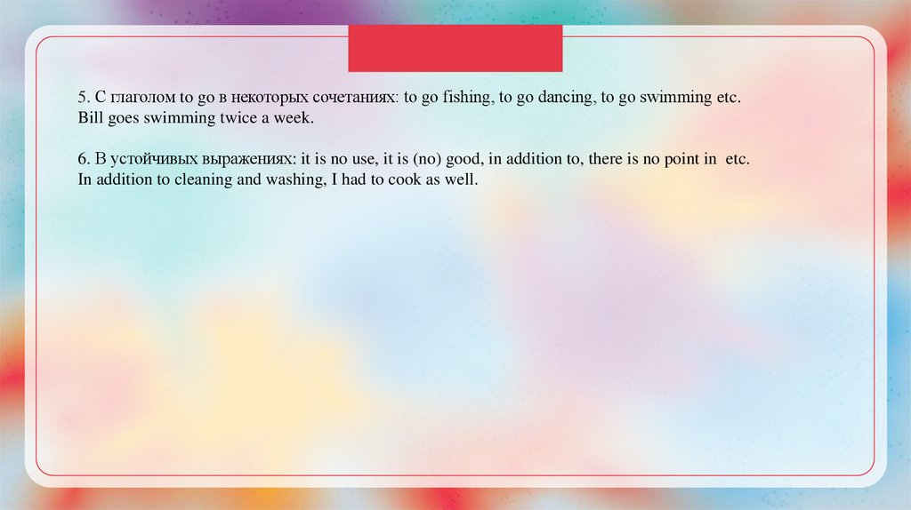 6. В устойчивых выражениях: it is no use, it is (no) good, in addition to, there is no point in etc.
