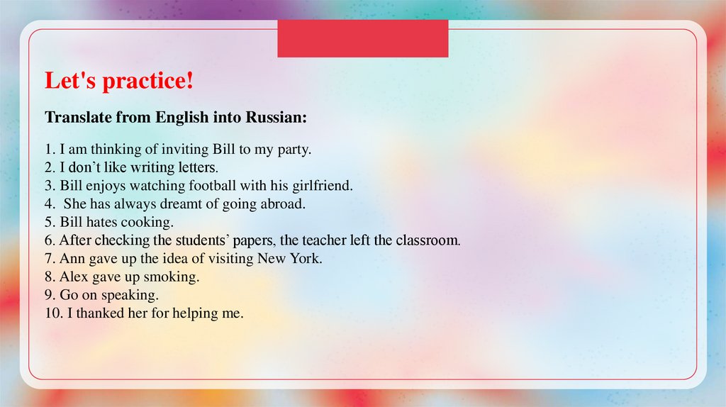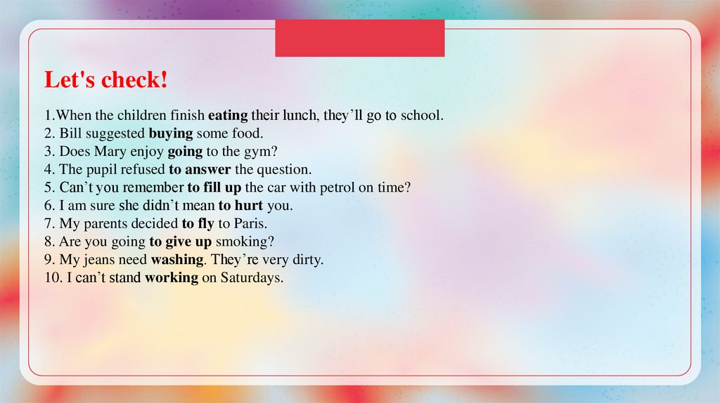3.После определенных глаголов: avoid, mind, suggest, discuss, keep, miss, practise, quit, recommend.