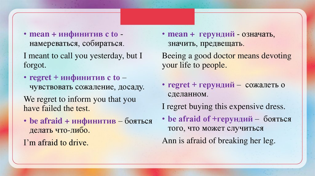 • mean + инфинитив с to намереваться, собираться.I meant to call you yesterday, but I