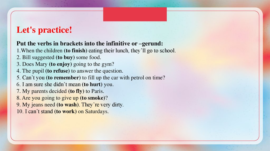 Let's practice!Put the verbs in brackets into the infinitive or –gerund: