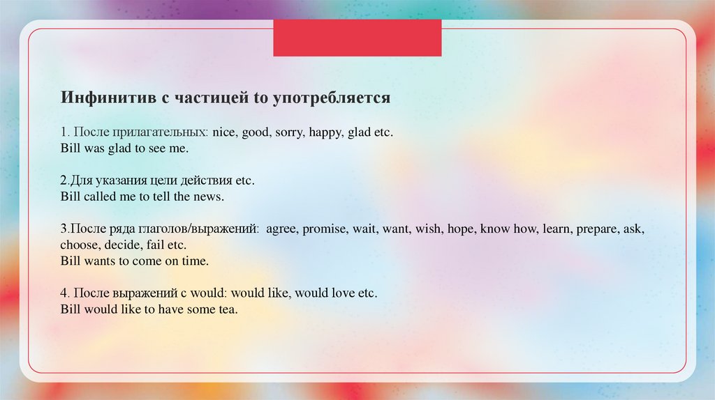 Инфинитив с частицей to употребляется1. После прилагательных: nice, good, sorry, happy, glad etc.