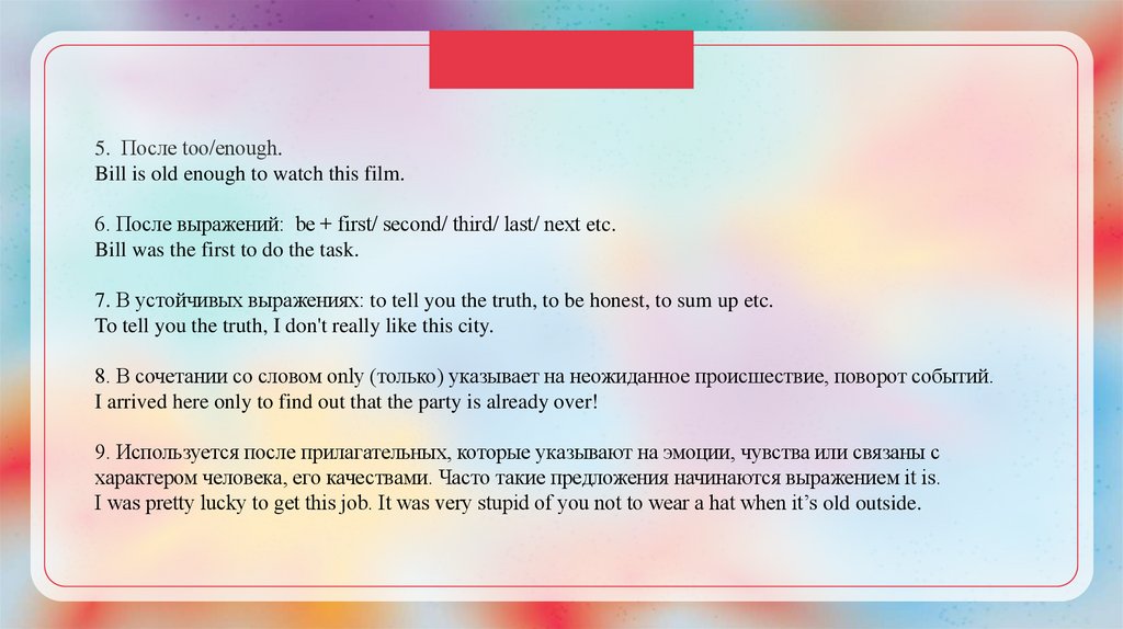 6. После выражений: be + first/ second/ third/ last/ next etc.