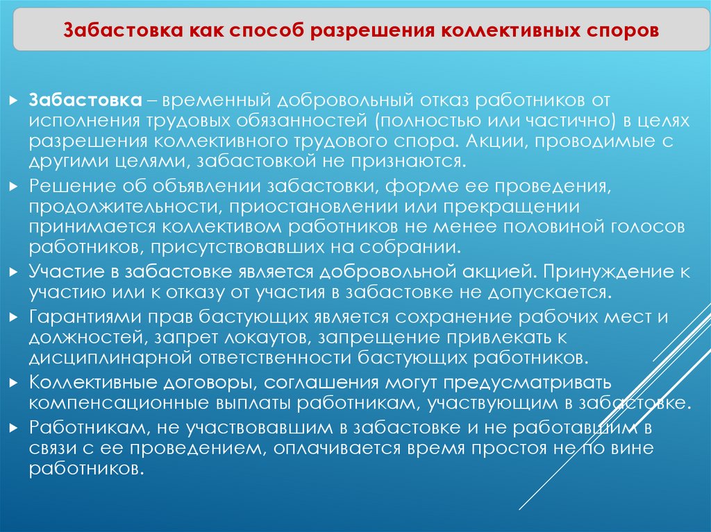 Забастовка как способ разрешения коллективных споровЗабастовка – временный добровольный отказ работников от