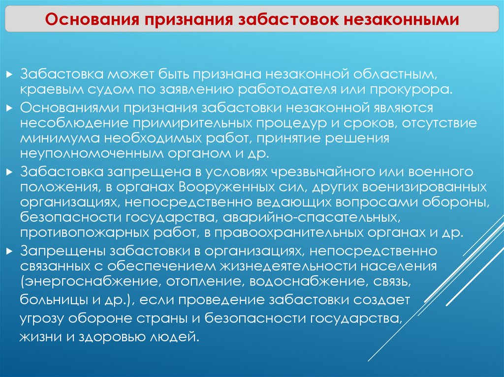 Основания признания забастовок незаконнымиЗабастовка может быть признана незаконной областным,