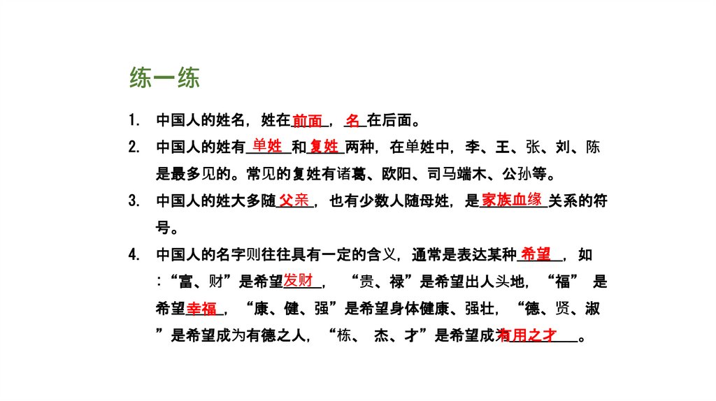 中国人的姓名1. 中国人的姓名 姓在前面 名在后面。