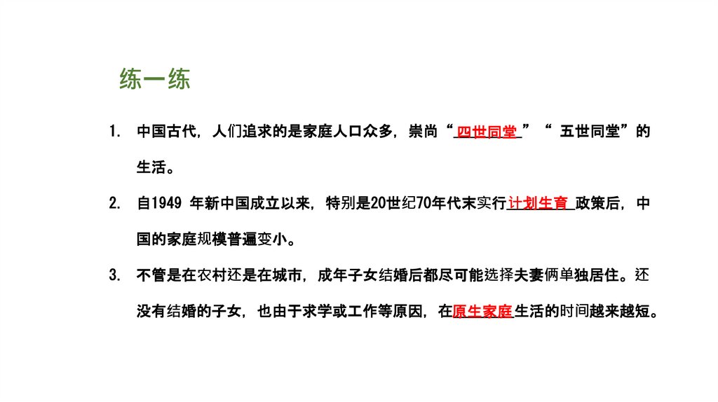 练一练1. 中国人非常注重______和血缘关系。中国古代有“_______ 不远游