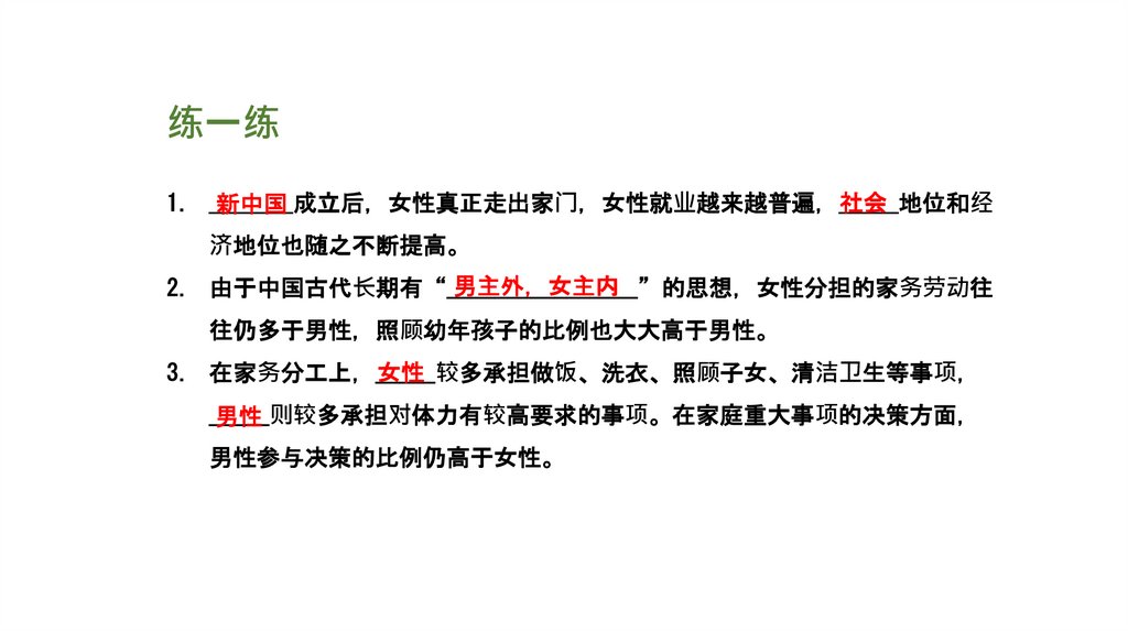1. _______成立后 女性真正走出家门 女性就业越来越普遍 _____地位和经