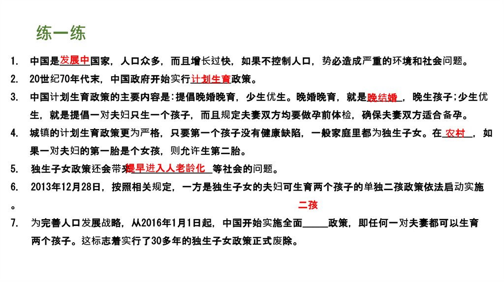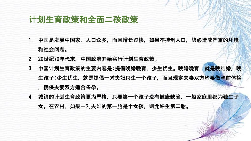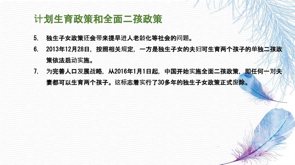 计划生育政策和全面二孩政策1. 中国是发展中国家 人口众多 而且增长过快 如果不控制人口 势必造成严重的环境