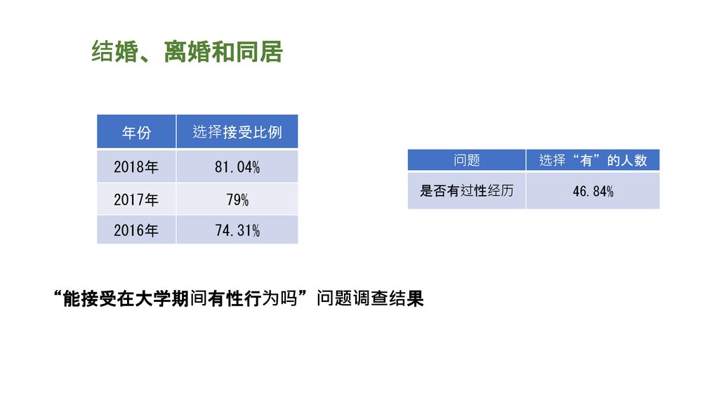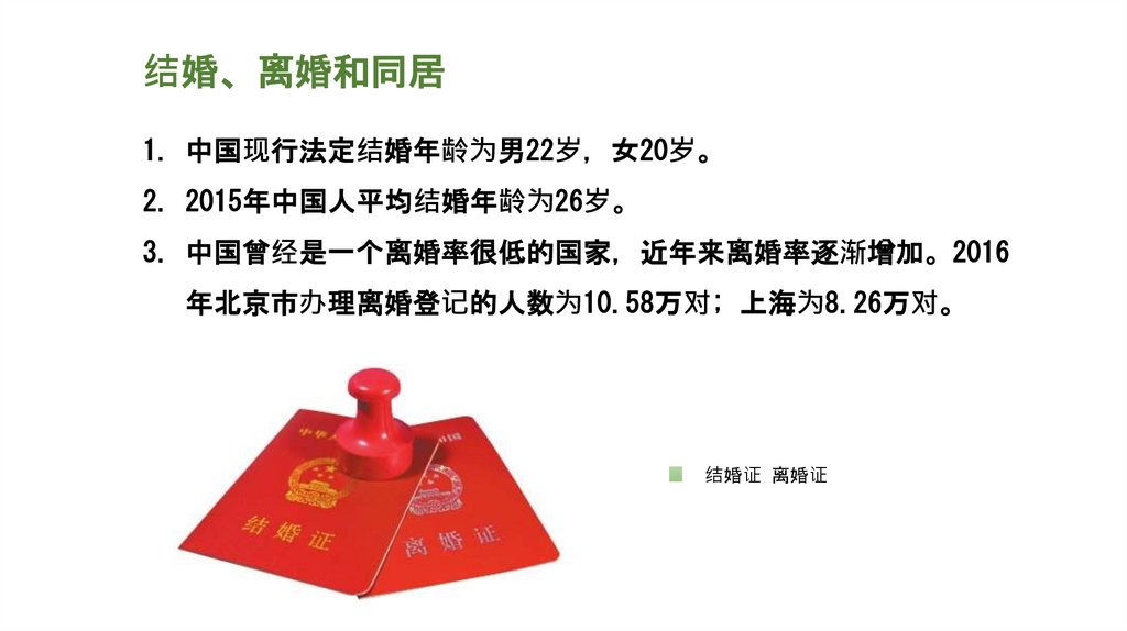 结婚、离婚和同居1. 中国现行法定结婚年龄为男22岁 女20岁。