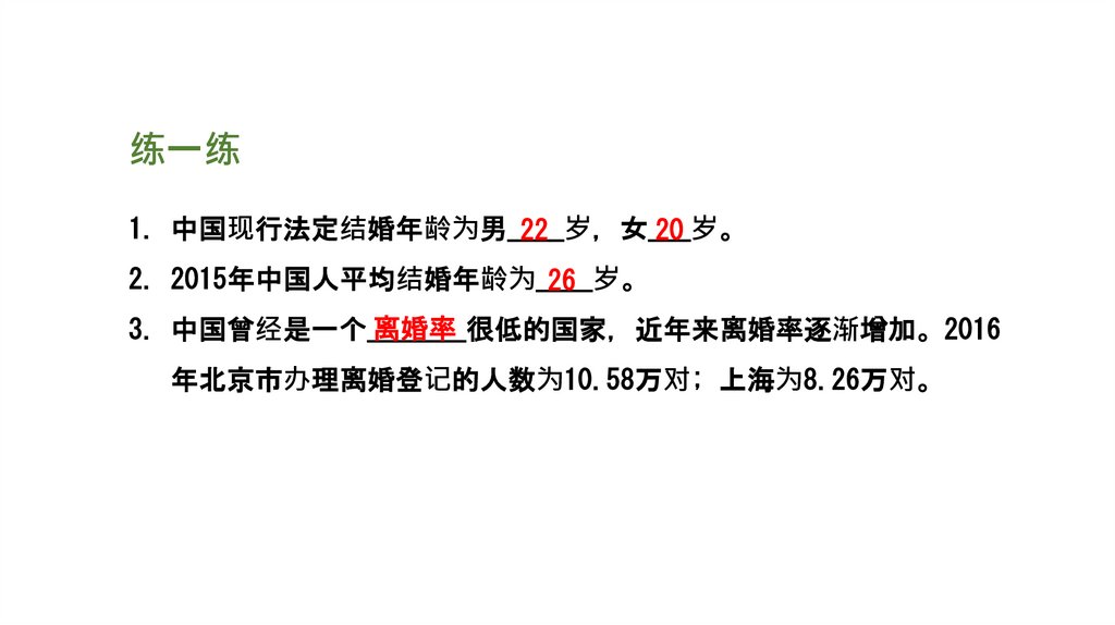 练一练1. 中国现行法定结婚年龄为男____岁 女___岁。
