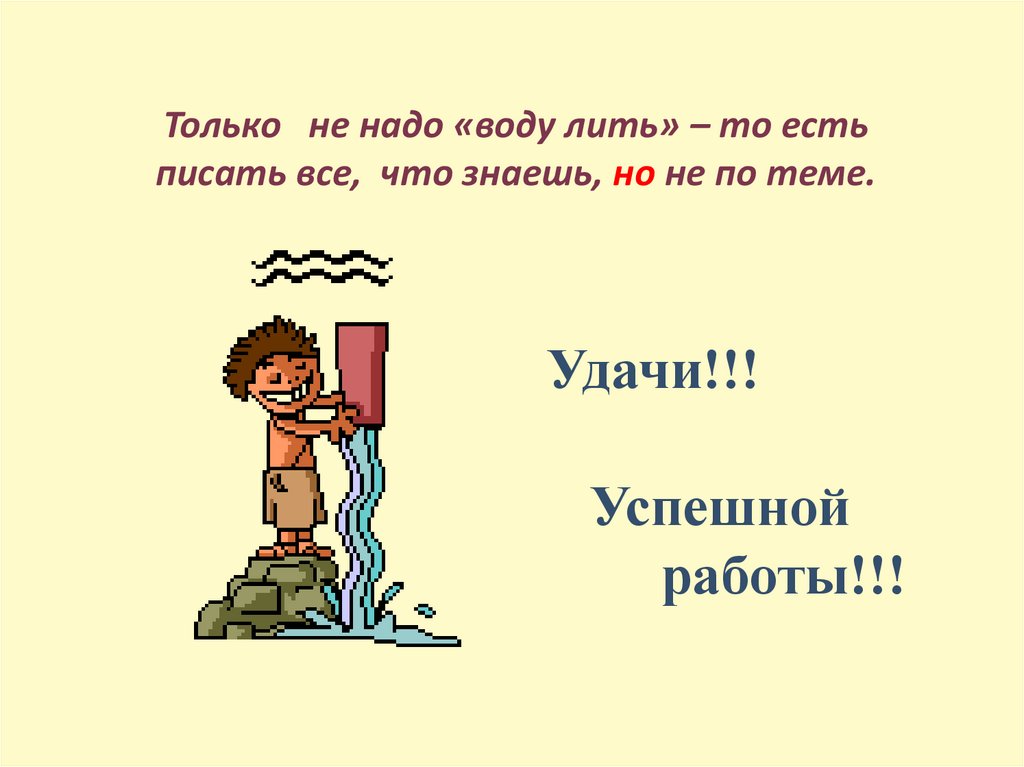 Только не надо «воду лить» – то естьписать все, что знаешь, но не по теме.