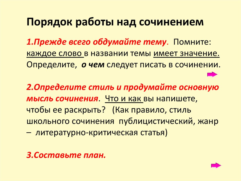Порядок работы над сочинением1.Прежде всего обдумайте тему. Помните: