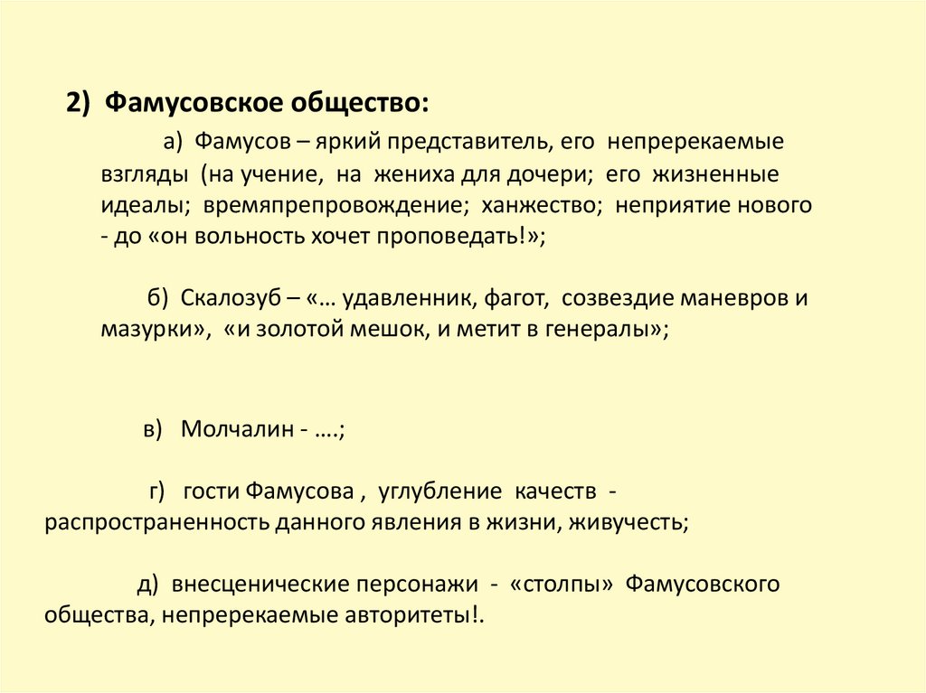 2) Фамусовское общество:а) Фамусов – яркий представитель, его непререкаемые