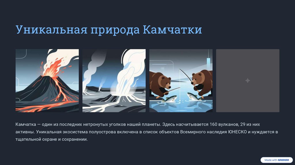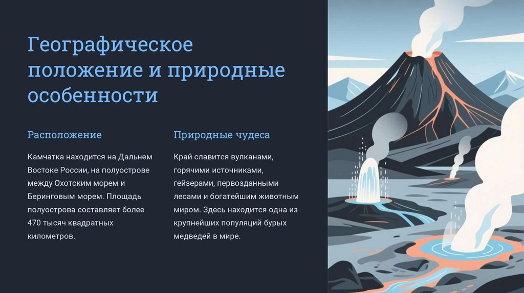 Уникальная природа КамчаткиКамчатка — один из последних нетронутых уголков нашей планеты. Здесь насчитывается 160 вулканов, 29 из них