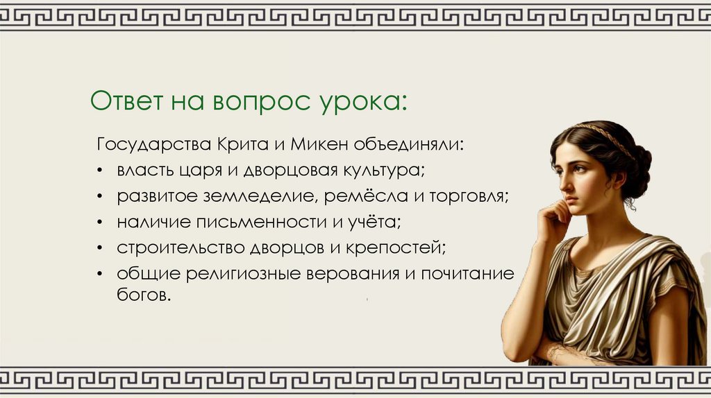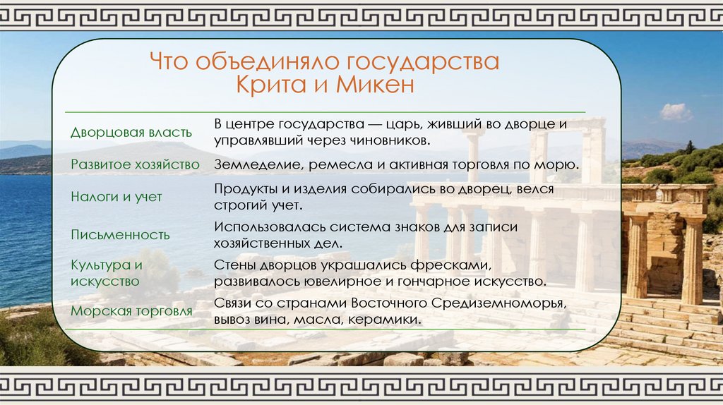 Ответ на вопрос урока:Государства Крита и Микен объединяли: