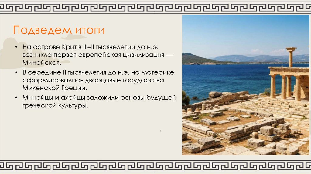 Подведем итоги• На острове Крит в III–II тысячелетии до н.э.