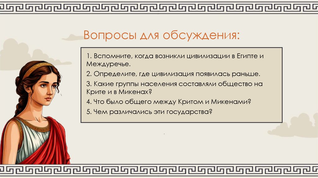Вопросы для обсуждения:1. Вспомните, когда возникли цивилизации в Египте и