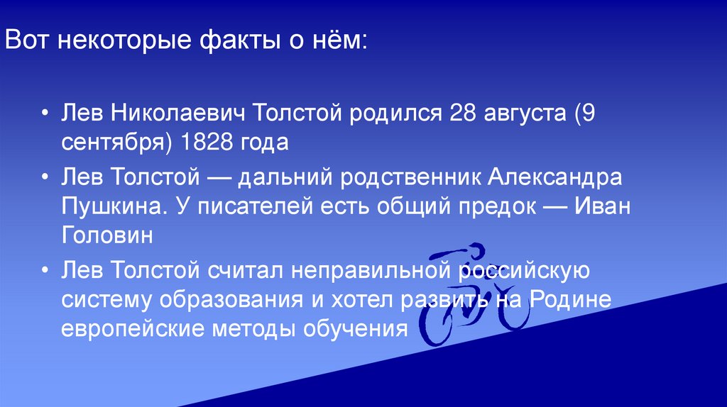 Вот некоторые факты о нём:• Лев Николаевич Толстой родился 28 августа (9