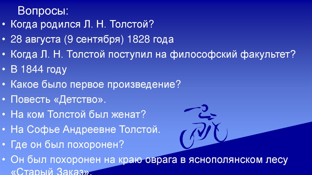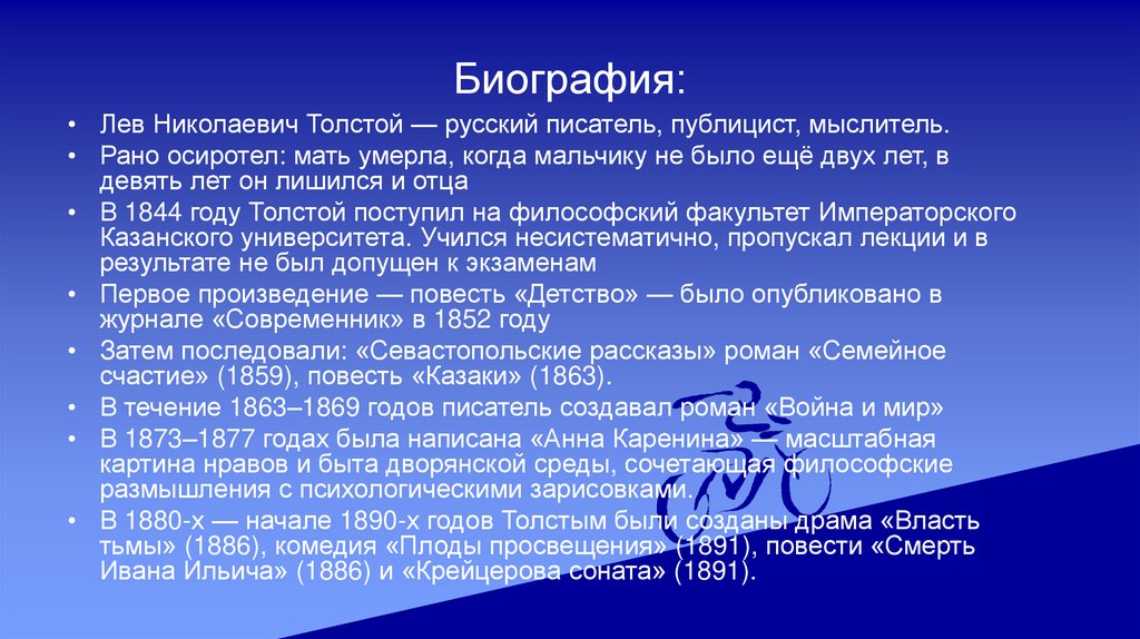 Биография:• Лев Николаевич Толстой — русский писатель, публицист, мыслитель.