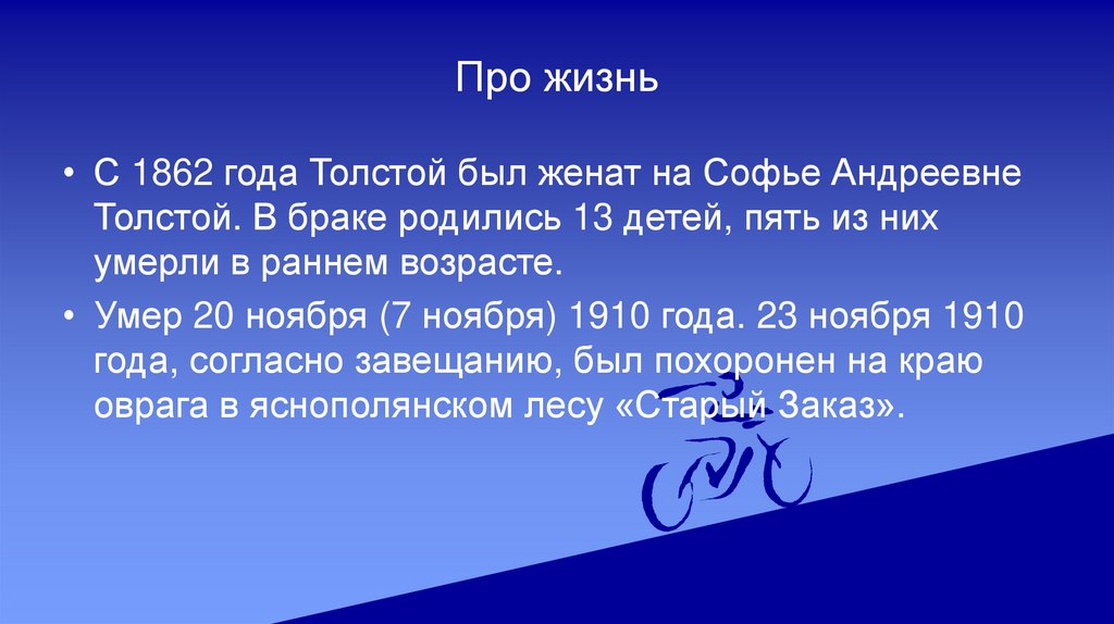Про жизнь• С 1862 года Толстой был женат на Софье Андреевне