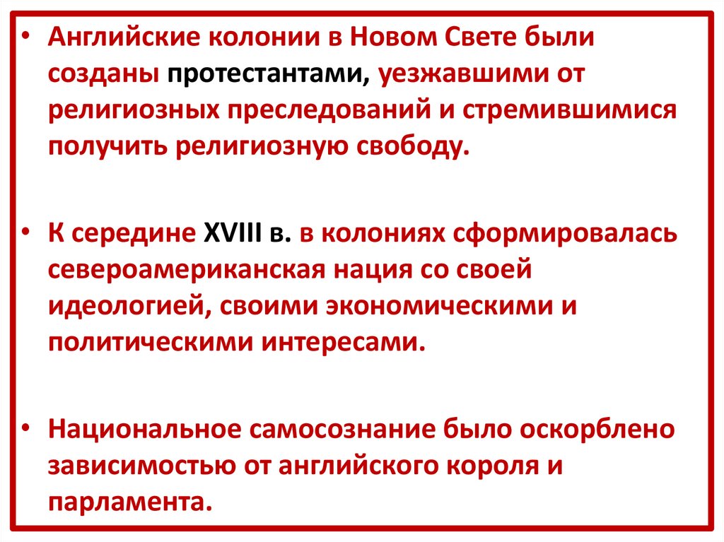 • Английские колонии в Новом Свете былисозданы протестантами, уезжавшими от