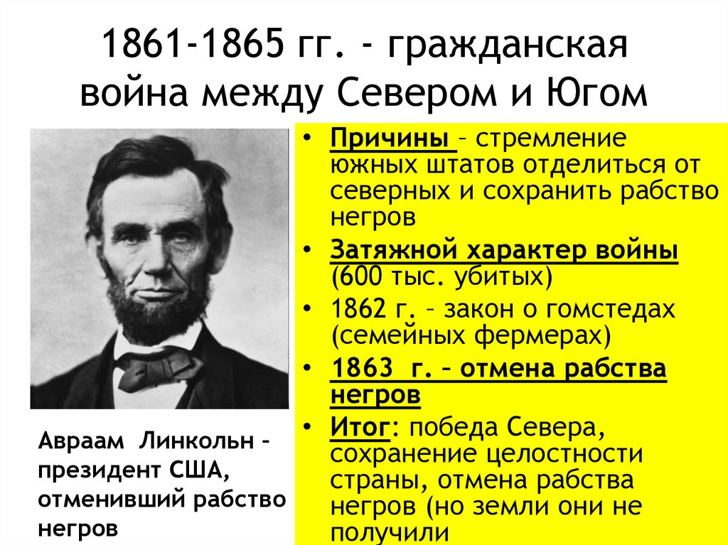 1861-1865 гг. - гражданскаявойна между Севером и Югом