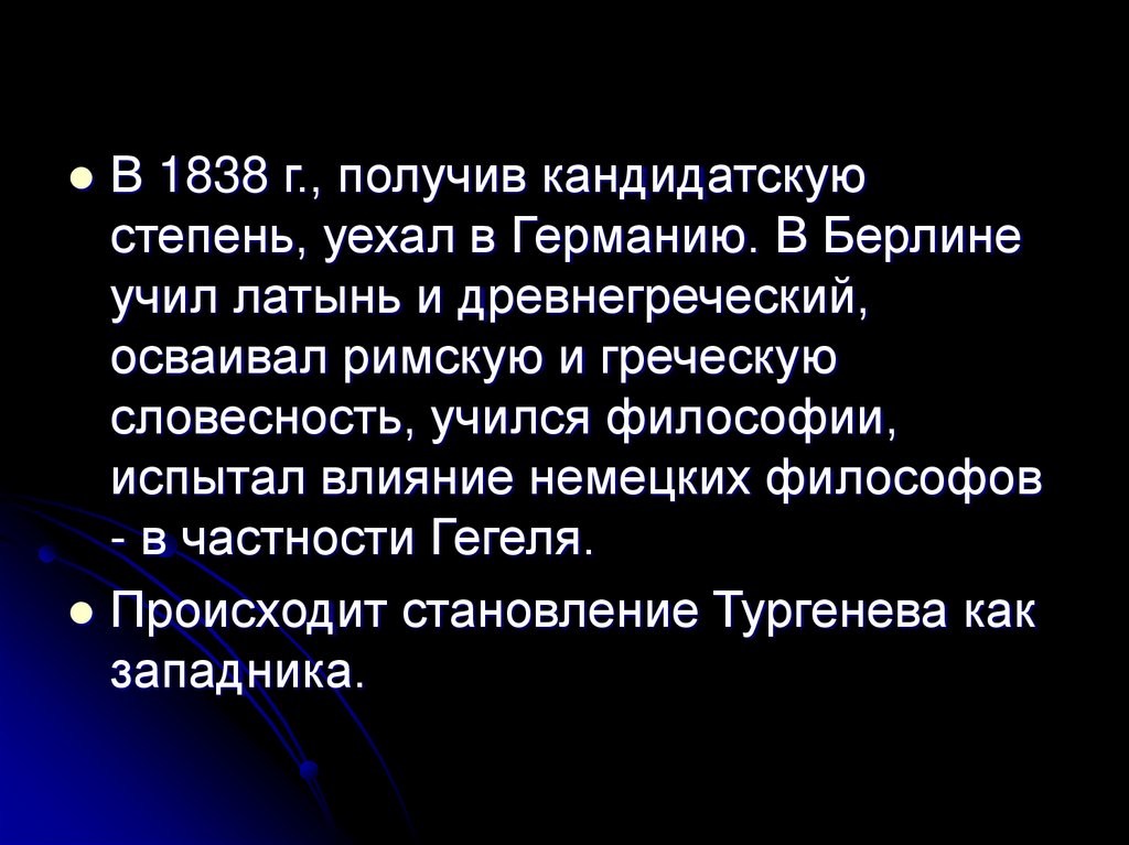 В 1838 г., получив кандидатскуюстепень, уехал в Германию. В Берлине