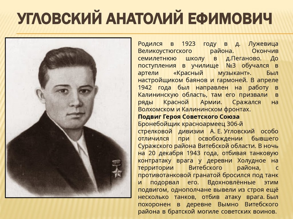 присвоили 15 мая 1946 года посмертно. Не дожив всего 7 дней до победы, он внес своё имя и