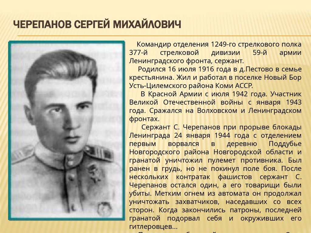 Указом Президиума Верховного Совета СССР от 5 октября 1944 года сержантуЧерепанову Сергею Михайловичу посмертно присвоено звание Героя Советского