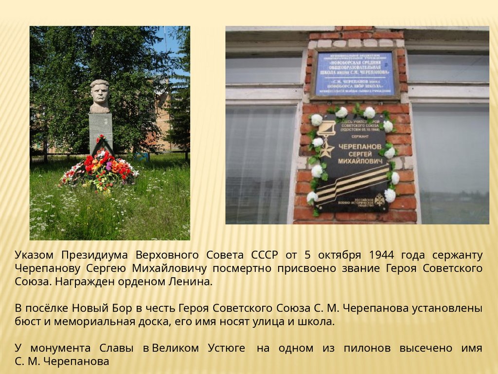 В посёлке Новый Бор в честь Героя Советского Союза С. М. Черепанова установлены