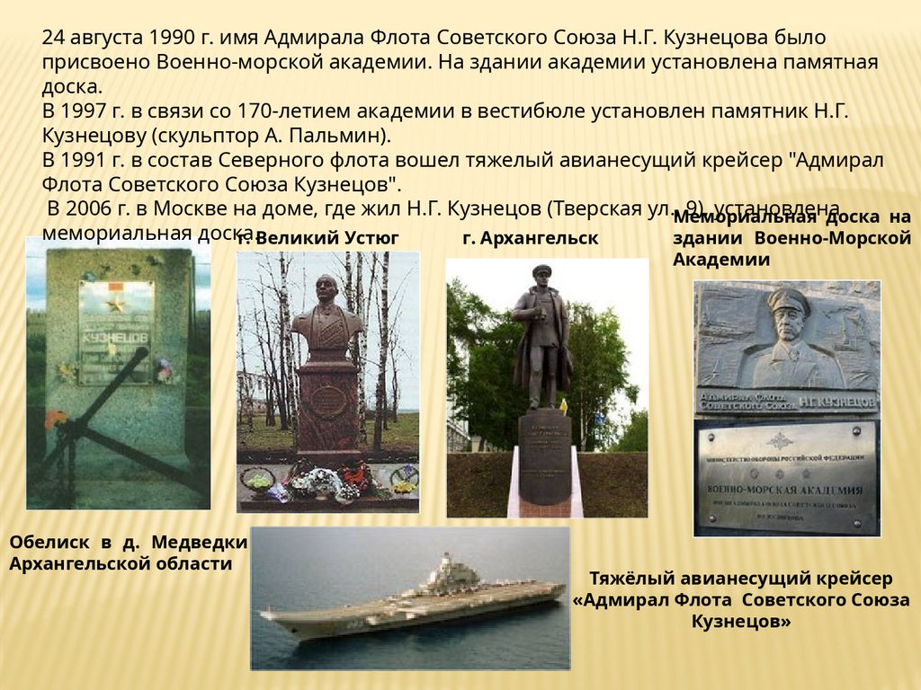 24 августа 1990 г. имя Адмирала Флота Советского Союза Н.Г. Кузнецова былоприсвоено Военно-морской академии. На здании академии установлена памятная