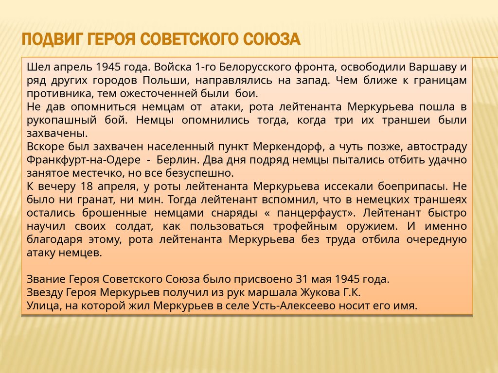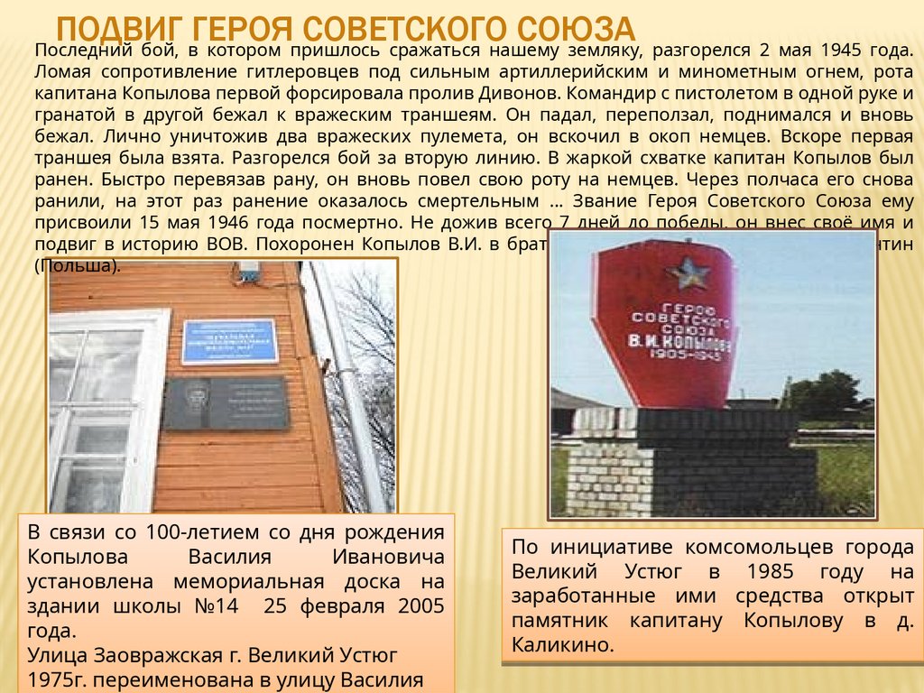 ПОДВИГ ГЕРОЯ СОВЕТСКОГО СОЮЗАПоследний бой, в котором пришлось сражаться нашему земляку, разгорелся 2 мая 1945 года.