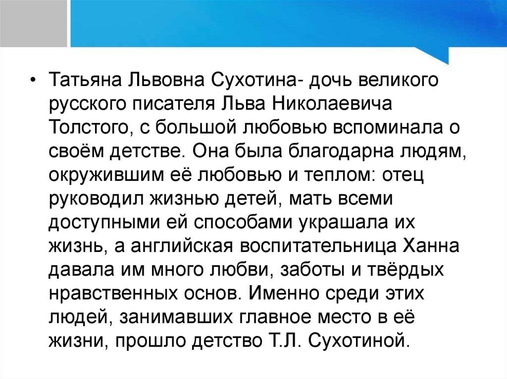 1. Как вспоминает своё детство Т. Сухотина?2. Каким людям она особенно благодарна за своё