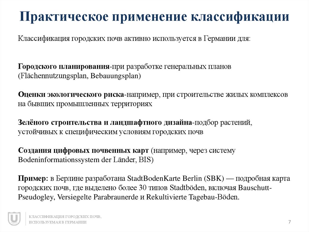 Практическое применение классификацииКлассификация городских почв активно используется в Германии для: