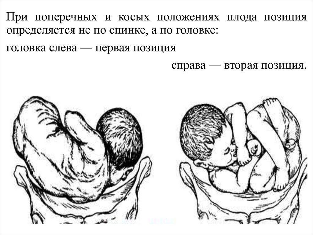 При поперечных и косых положениях плода позицияопределяется не по спинке, а по головке: