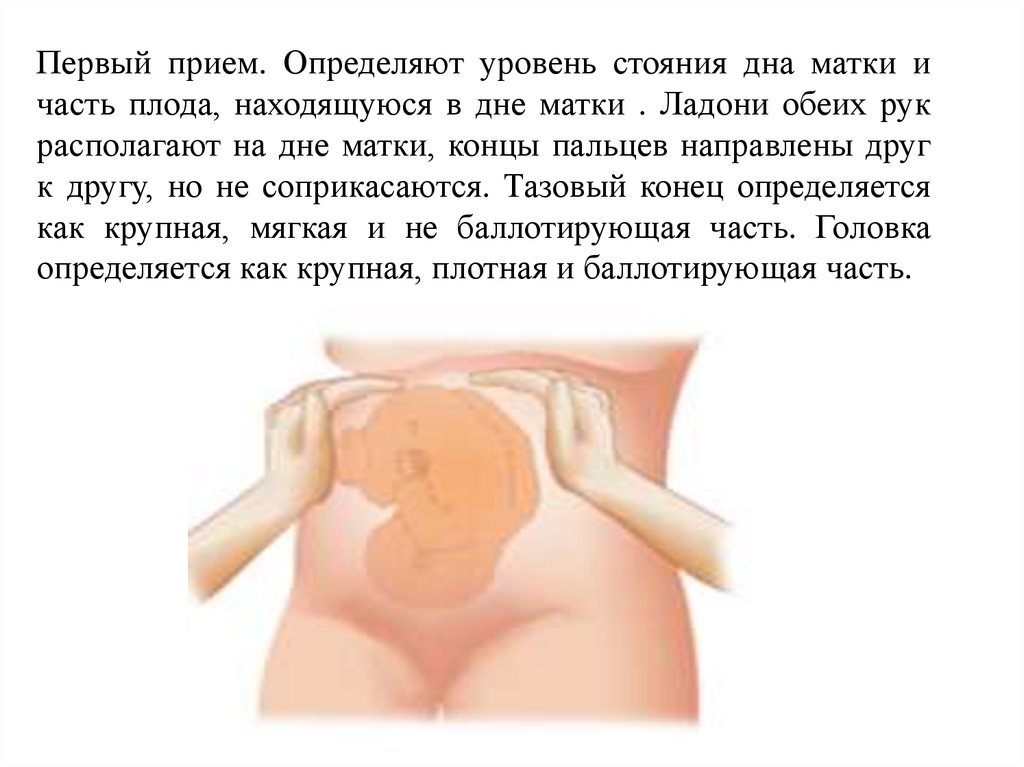 Первый прием. Определяют уровень стояния дна матки ичасть плода, находящуюся в дне матки . Ладони обеих рук