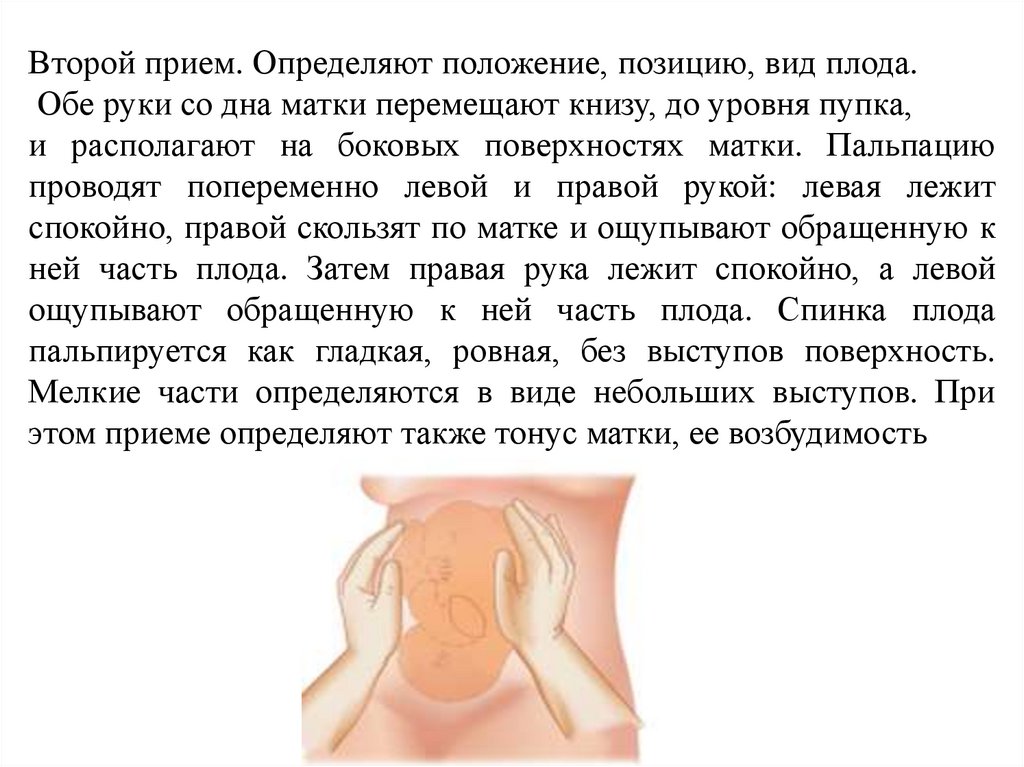 Второй прием. Определяют положение, позицию, вид плода.Обе руки со дна матки перемещают книзу, до уровня пупка,