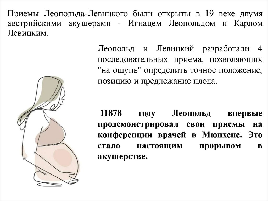 Приемы Леопольда-Левицкого были открыты в 19 веке двумяавстрийскими акушерами - Игнацем Леопольдом и Карлом