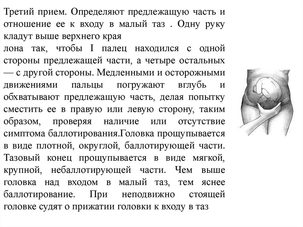 Третий прием. Определяют предлежащую часть иотношение ее к входу в малый таз . Одну руку