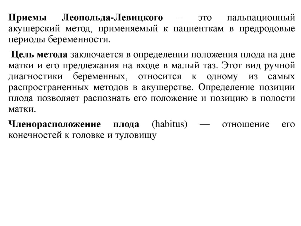 Приемы Леопольда-Левицкого – это пальпационныйакушерский метод, применяемый к пациенткам в предродовые