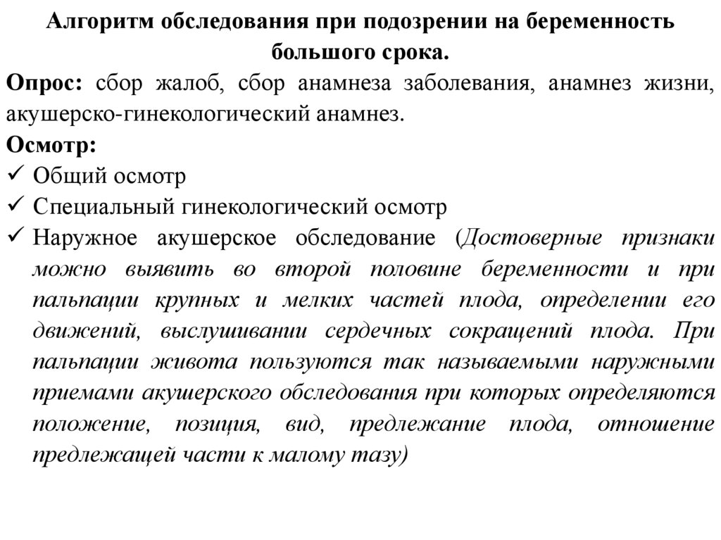 Алгоритм обследования при подозрении на беременностьбольшого срока.