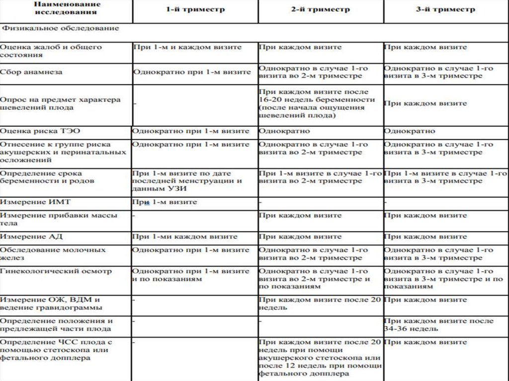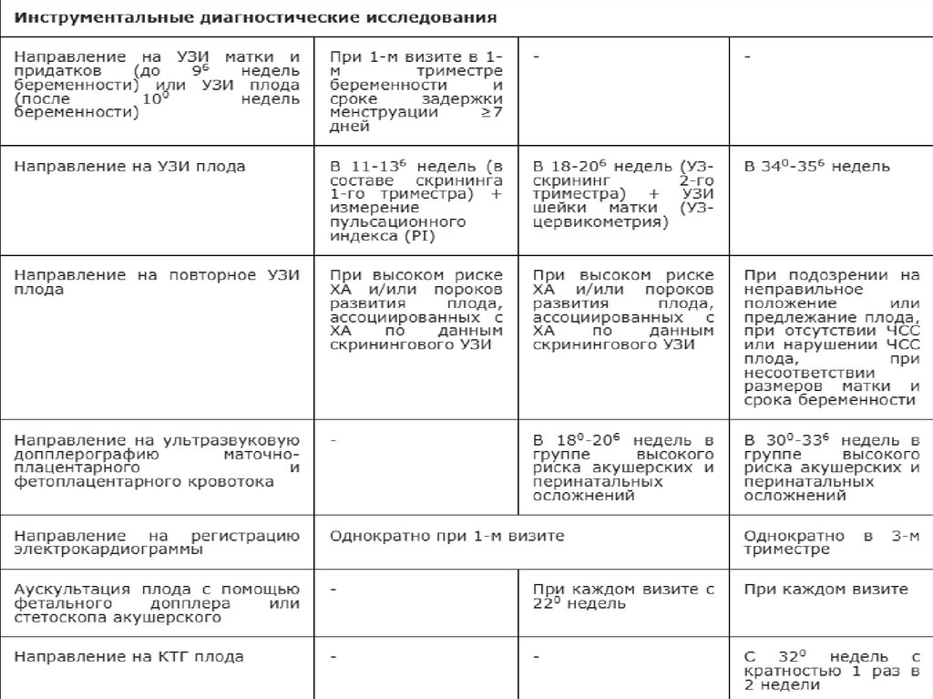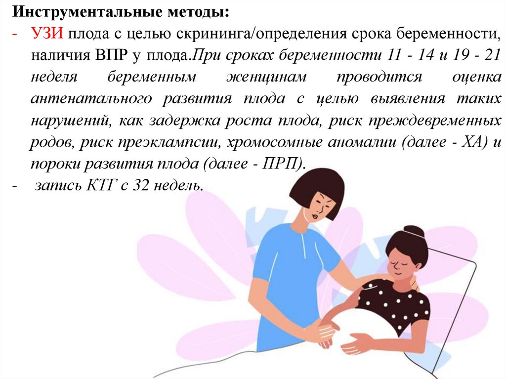 Инструментальные методы:- УЗИ плода с целью скрининга/определения срока беременности,