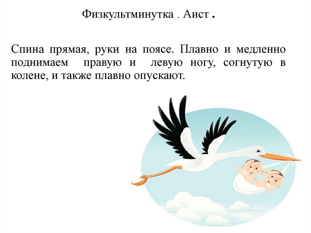 Физкультминутка . Аист .Спина прямая, руки на поясе. Плавно и медленно