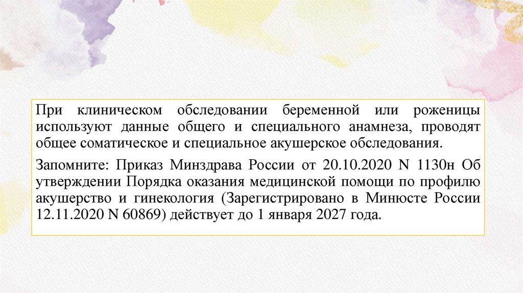 При клиническом обследовании беременной или роженицыиспользуют данные общего и специального анамнеза, проводят
